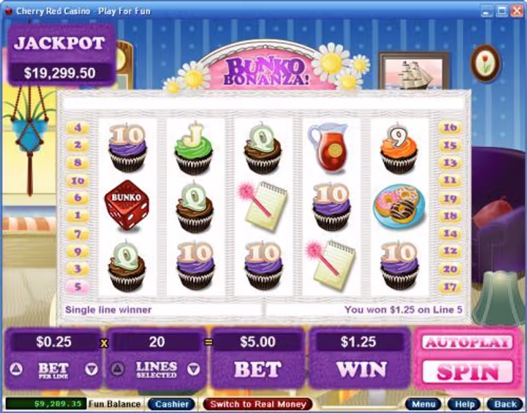 Get ready for a delightful gaming experience that combines the social fun of bunko with the sweet rewards of a bakery-themed slot machine. Bunko Bonanza Slots from Real Time Gaming serves up a unique blend of dice-rolling excitement and mouth-watering treats that'll keep you spinning for more. This 5-reel, 20-payline video slot brings together the best of both worlds – the community spirit of bunko night and the potential for some seriously sweet payouts up to $100 per spin.